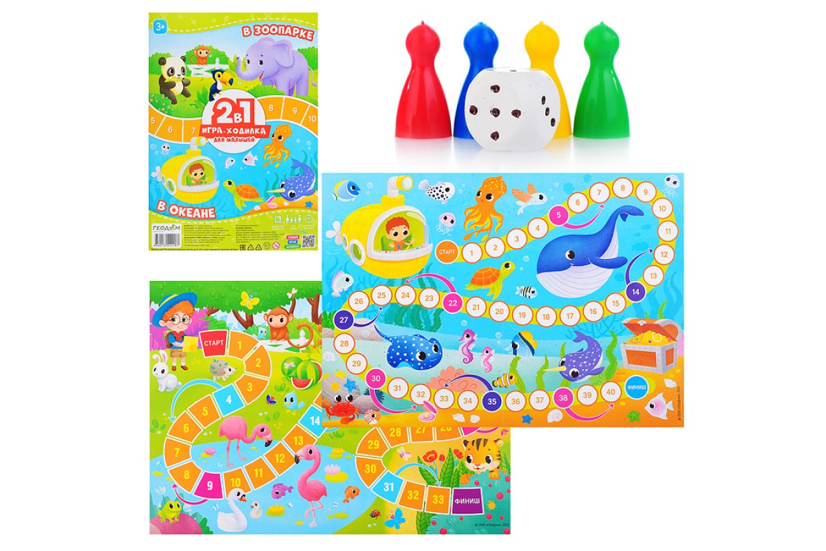 Игра-ходилка с фишками для малышей 2в1. В зоопарке+В океане