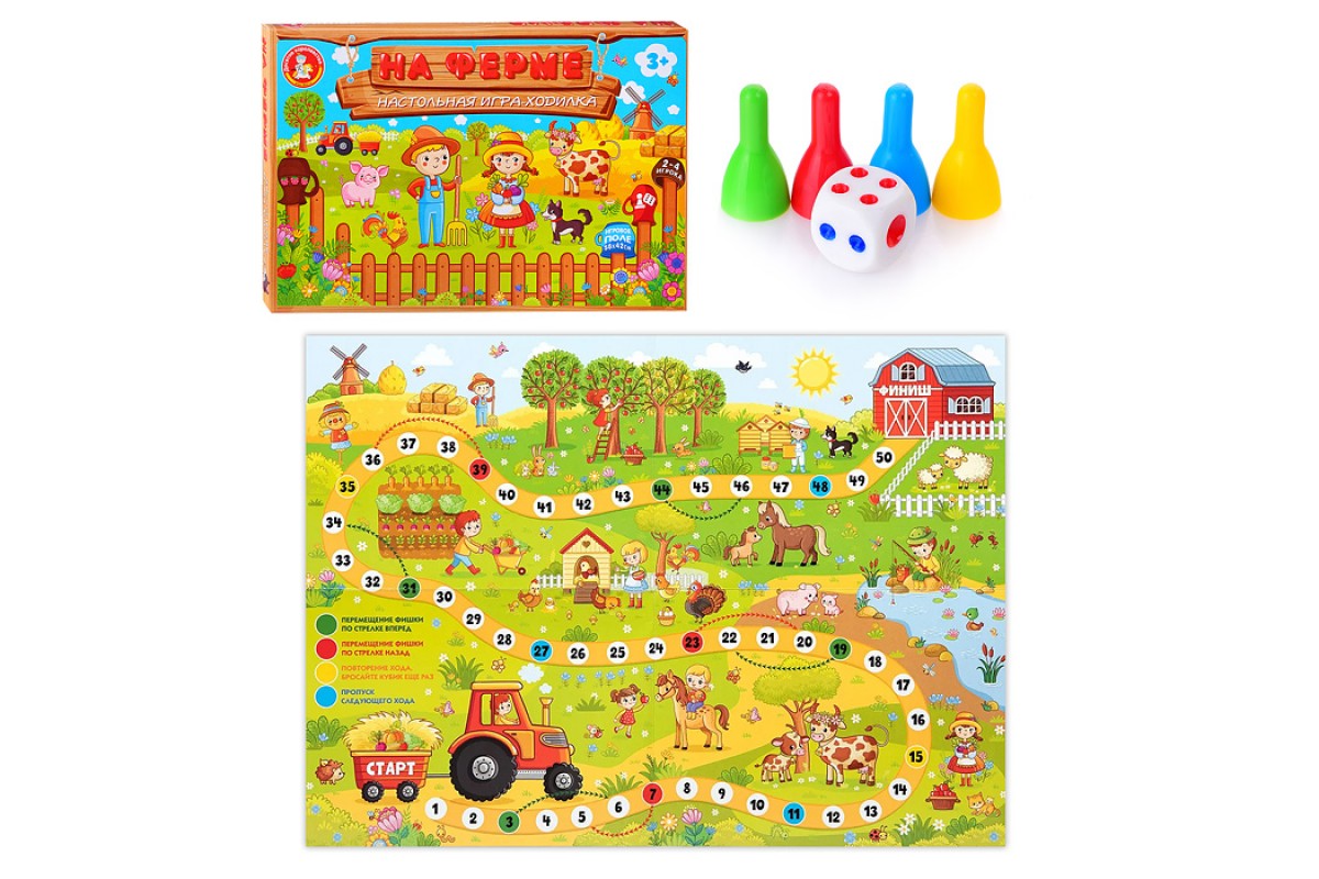 Детская настольная игра-ходилка «На ферме» поможет развить в себе познавательную активность, внимательность, память и познакомит с различными видами домашних животных.