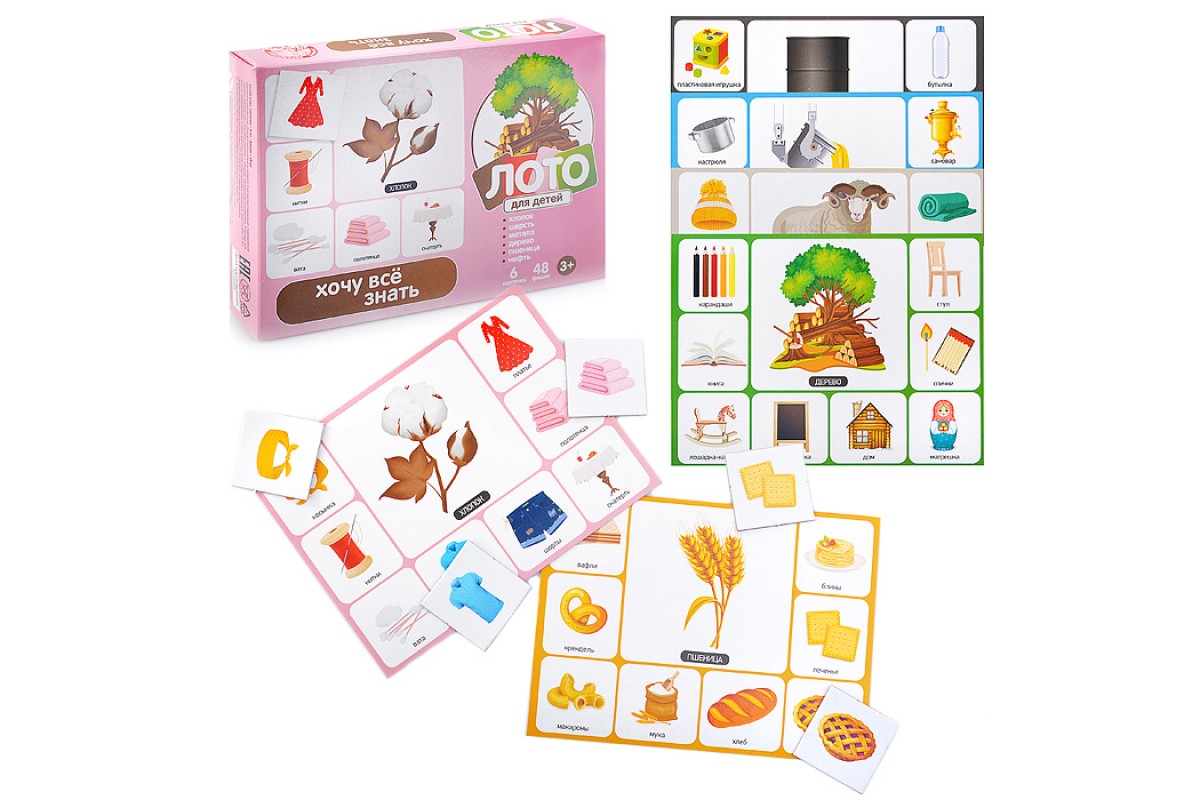 В комплекте: 6 больших карточек (размером 15x11 см); 48 маленьких карточек (размером 3,5x3,5 см).