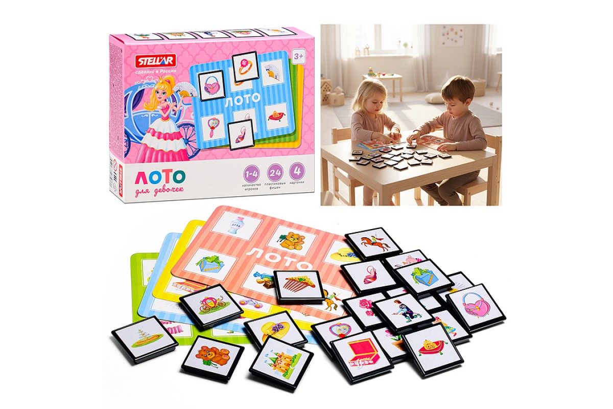 Лото «Для девочек» понравится малышкам, т.к. на фишках изображены зеркальце, цветочки, замки, принцы и т.д.