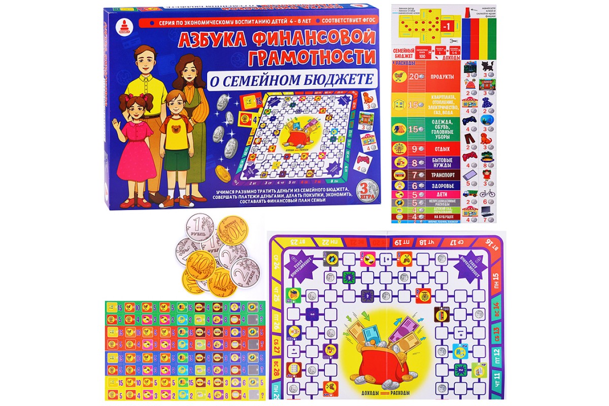 Комплектность: игровое поле, карта «доходы-расходы», карты покупок с ценами (18 шт.), листы «финансовый план семьи», карточки платежей (по 17 шт. на каждого игрока), монеты (140 шт.), фишки (4 шт.) и кубик.