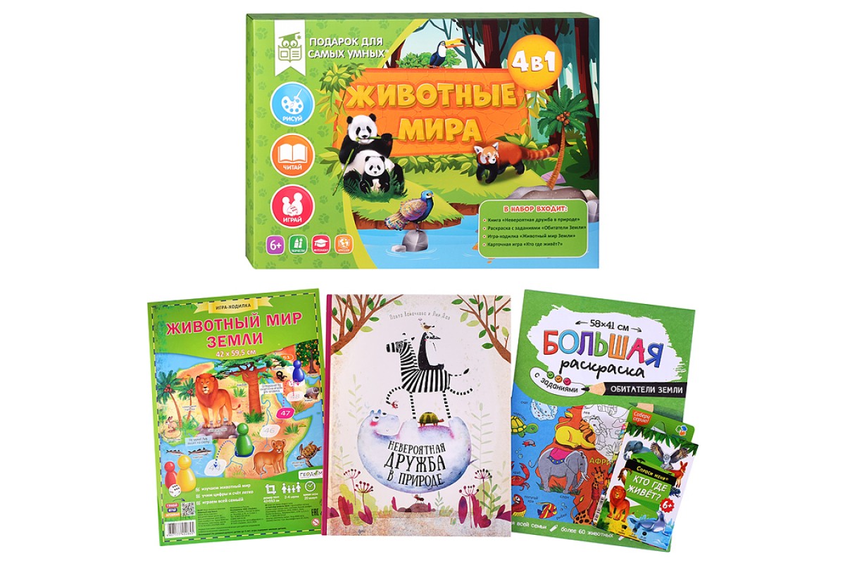 Подарок для самых умных. Животные мира. Книга+Большая раскраска+Игра-ходилка+Карточная игра.