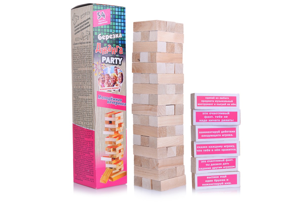 • Суть игры заключается в построении башни из которой потом игроками вытаскиваются бруски и ставятся вверх, тем самым продолжая башню. Тот кто завалит башню проиграл.
