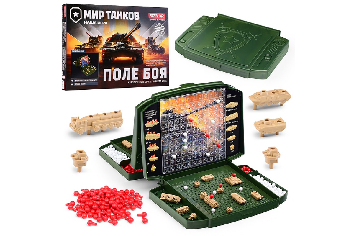 - 10 единиц бронетехники размером 1.2-3.2 см. (Тяжелый танк 1 шт.; Ракетный комплекс 1шт.; БТР 2 шт.; БМП 3 шт.; Турель 4 шт.); 120 белых фишек; 40 красных фишек.