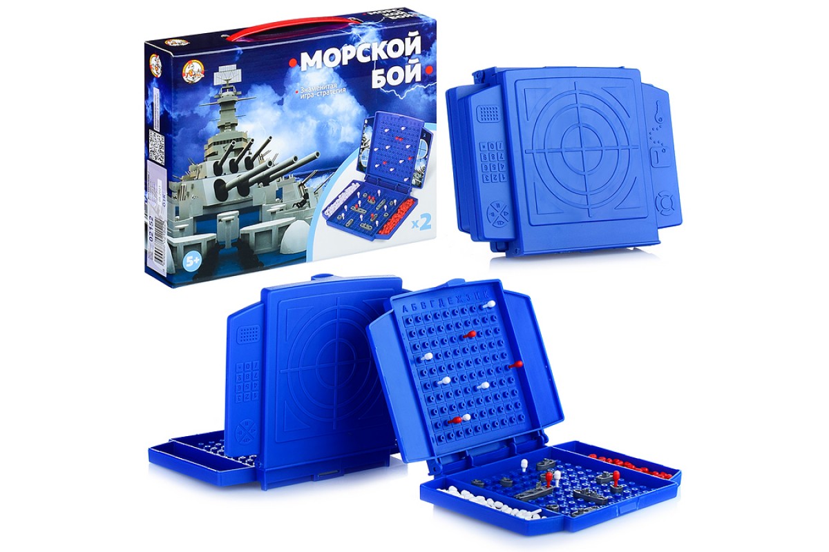 В комплект входит: 2 чемоданчика (16х12х2.5 см.) с игровыми полями (10.5х10.5 см.); 20 кораблей; 320 белых фишек; 80 красных фишек; лист с 4-мя декоративными наклейками.
