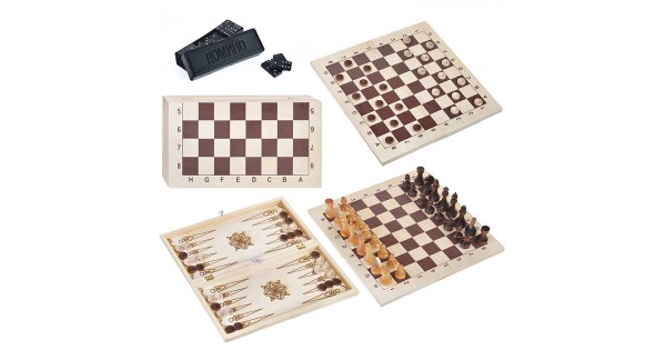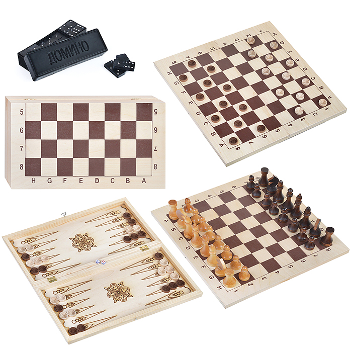 Набор 4в1 Шахматы гроссмейстерские + шашки деревянные + нарды + домино с доской (415х215мм)