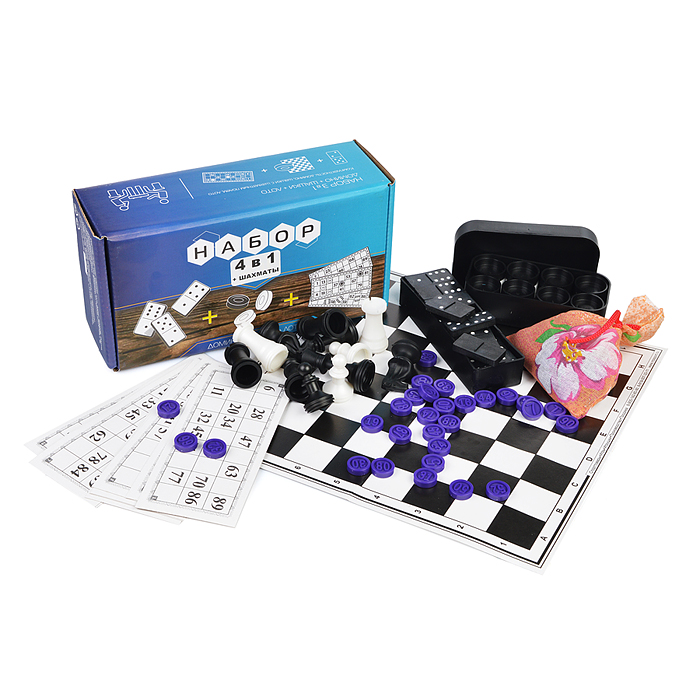 Набор 4в1 лото (пластик) шашки, домино, шахматы, шахматное поле.