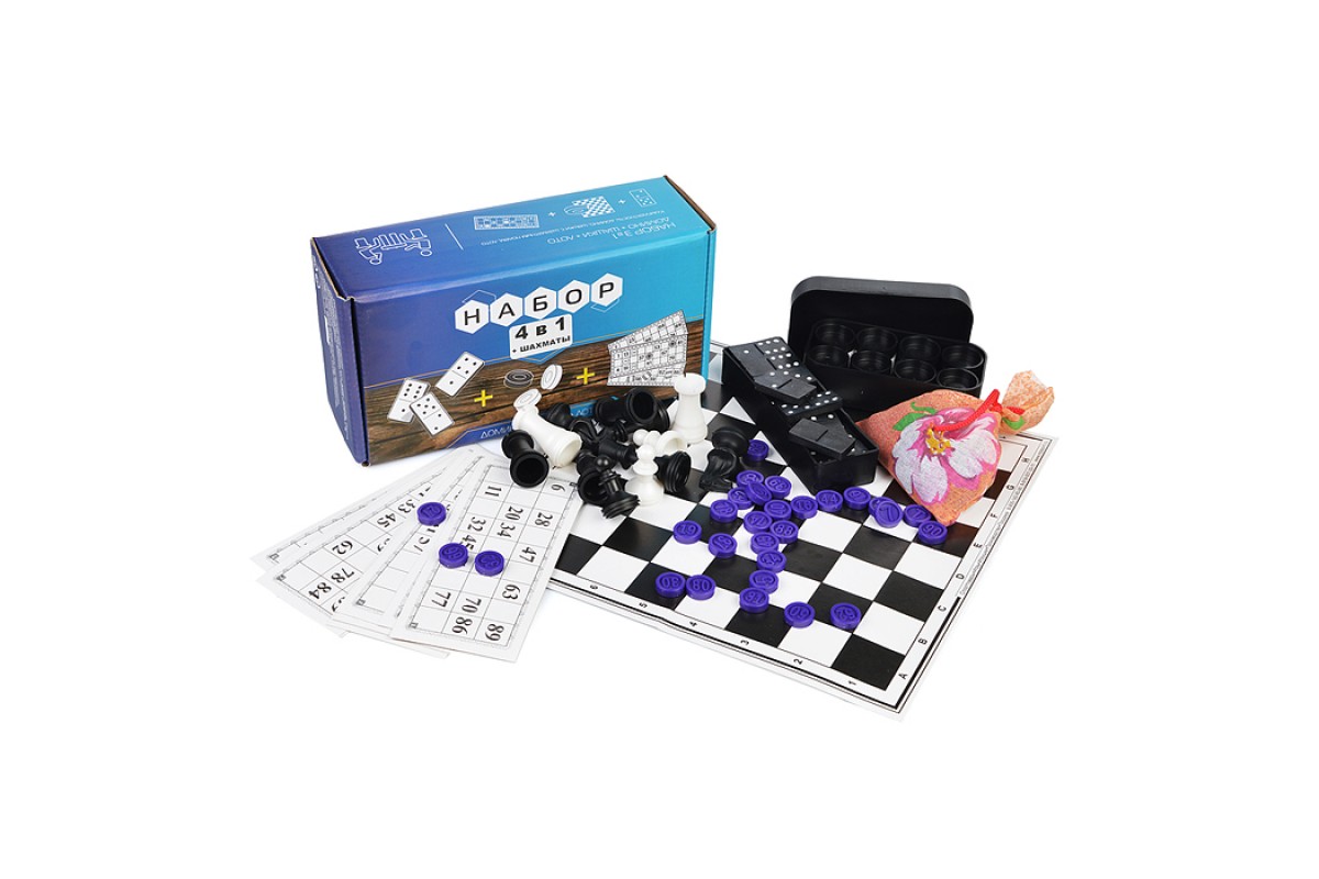 Набор 4в1 лото (пластик) шашки, домино, шахматы, шахматное поле.