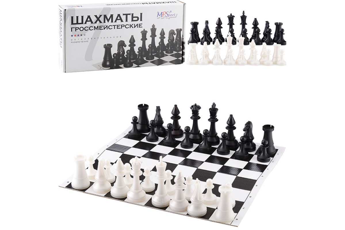Комплектность: 32 шахматные фигуры (высота короля 105 мм, пешки 50 мм; диаметр основания 37 мм); 1 поле шахматное картонное (39х39 см); упаковка (коробка).
