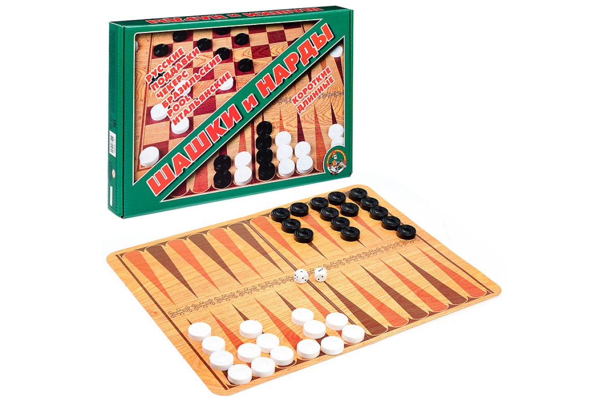 В комплект игры входит двустороннее складное поле из жёсткого картона 42 х 32 см., шашки пластмассовые двух цветов диаметром основания 2,7 см. - 30 шт., кубики игральные 1.5 см. - 2 шт., правила игры в нарды.
