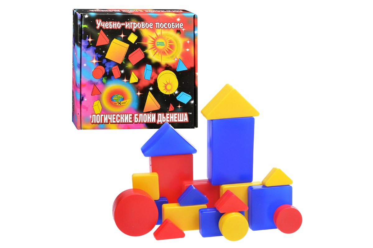 • Набор логических блоков состоит из 48 объемных геометрических фигур, различающихся по форме, цвету, размеру и толщине. Каждая фигура характеризуется четырьмя свойствами: цветом, формой, размером и толщиной. В наборе нет двух одинаковых фигур!