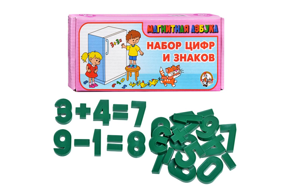 • Набор включает в себя цифры, знаки и комплект магнитов-вкладышей к ним