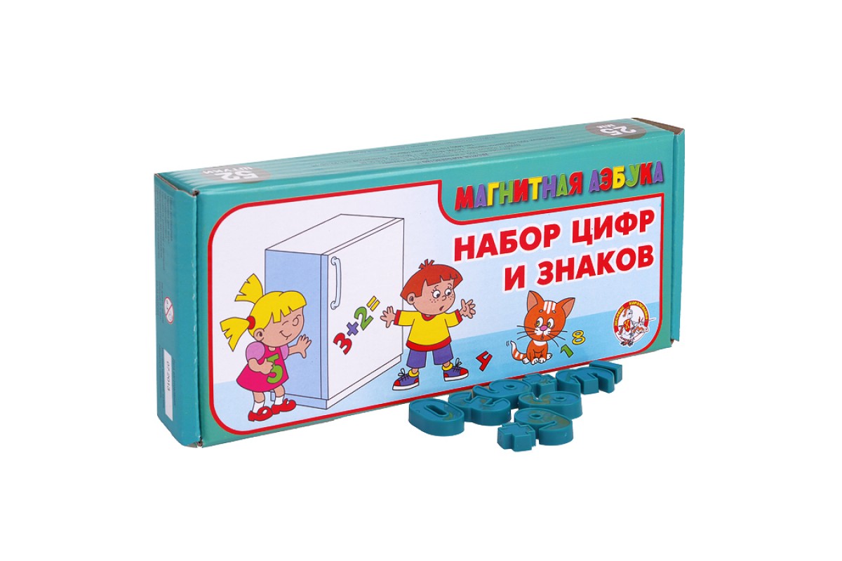 Состав набора: пластиковые цифры и знаки - 52 шт. (высота 2,5 см); магнитные вкладыши - 52 шт. (1х0,5 см).