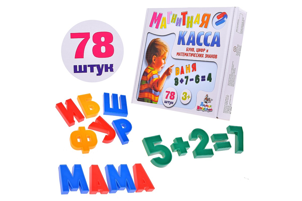 В наборе 78 пластмассовых элементов, высотой 3,5 см. четырех основных цветов – красного, синего, желтого и зеленого, а также магнитные вкладыши к ним.