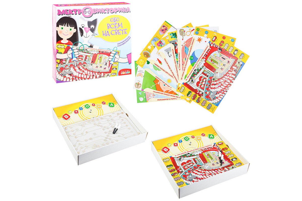В комплекте: 10 двухсторонних карточек из бумаги, плата, светозвуковой модуль, две батарейки 1,5V, правила игры.