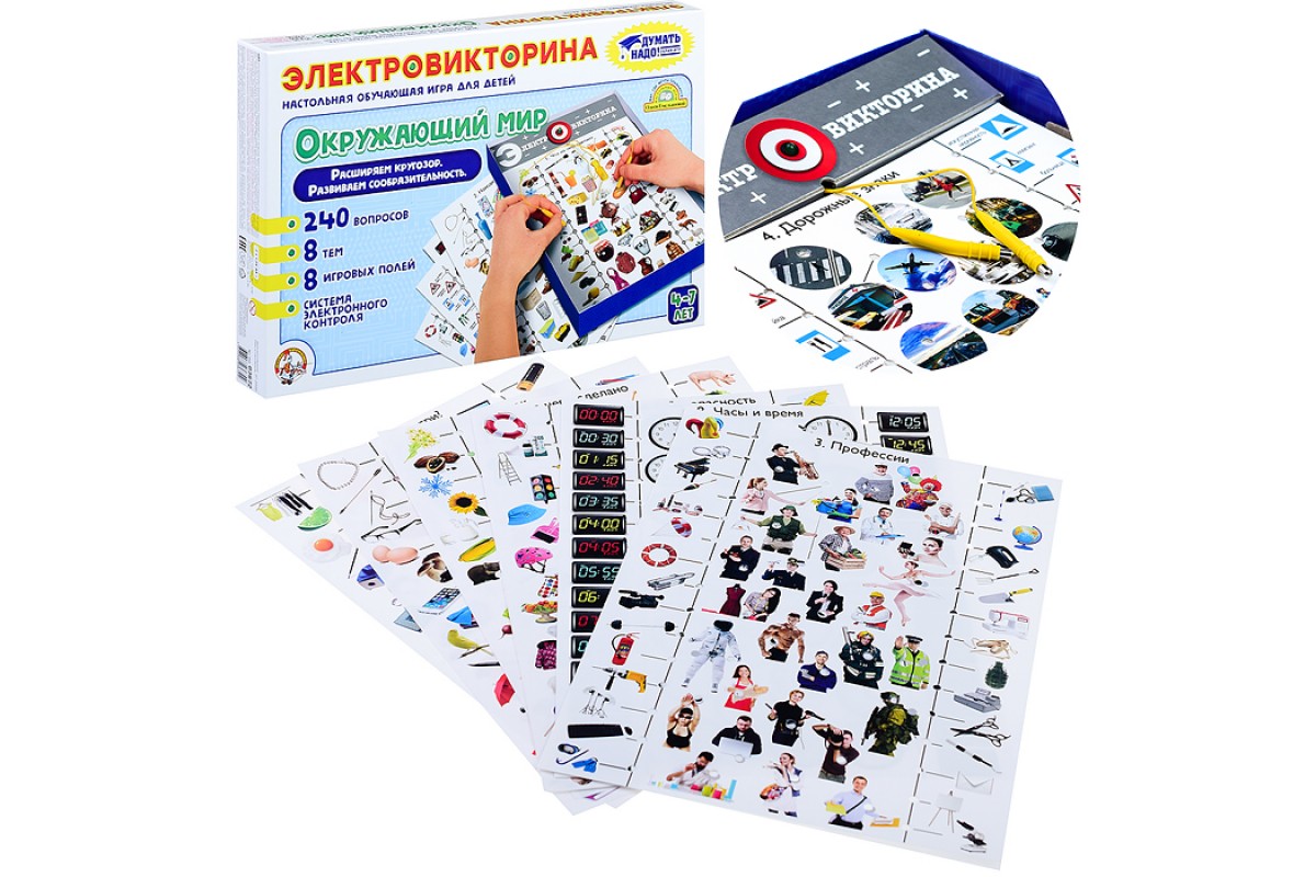 В комплекте 240 вопросов-заданий на 8 игровых полях; система электронного контроля; правила игры.