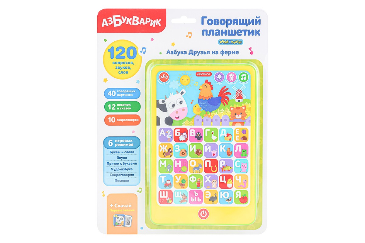 Музыкальный планшетик знает 2 сказки («Солнышко», «Колосок») и 3 обучающие песенки («Польза на ферме», «Учим буквы и поём», «Считалочка на ферме»). А для веселых танцев планшет сыграет 7 зажигательных песенок: («Барбарики (Что такое доброта?)», «Песенка фермера», «Лето», «Танец зверят», «Голосистый петушок», «Корова и пастушок», «Ходит котик по двору»). Все картинки звучат!