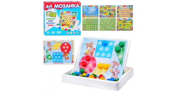 Игра 4в1 (Мозаика, Мемо, Лабиринт, Лото) Серия "Мозайкин" чемодан в коробке
