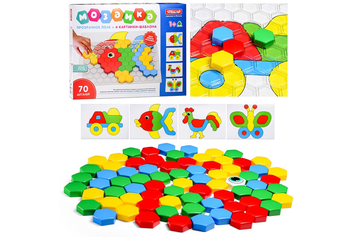 Также с помощью мозаики можно изучать цвета и понятие длины, выкладывая из фишек разные полоски.В наборе: