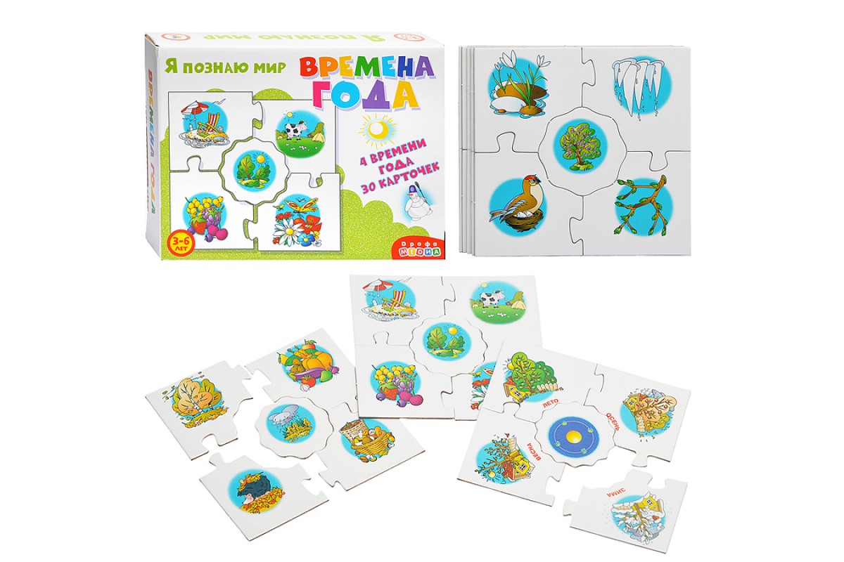 • Карточки содержат картинки с изображениями времён года, для объединения их в группы.