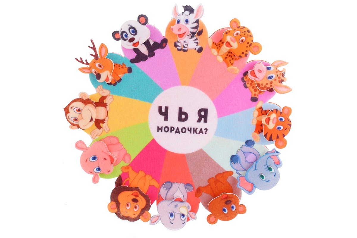 • В комплект входит игровая разноцветная основа (17х17 см.) и 12 элементов с изображением мордочек животных