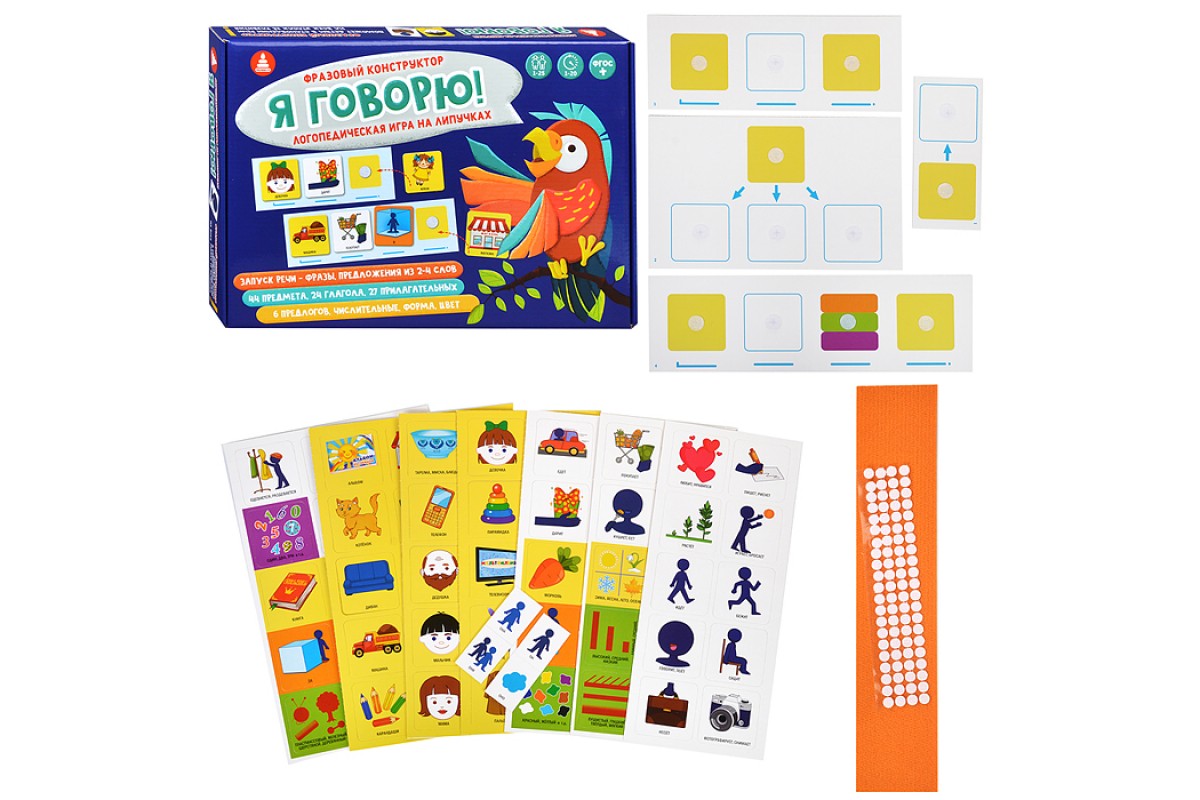 Комплектность: 4 схемы предложений, 4 схемы местоимений, лист ковролина для составления длинных предложений, 80 карт с изображениями предметов, их действий, признаков и 97 липучек.