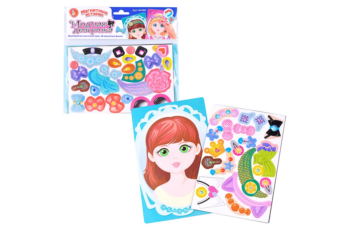 В комплект входит двустороннее магнитное поле 14,5х23,5 см; 45 магнитных элементов аксессуаров и украшений.