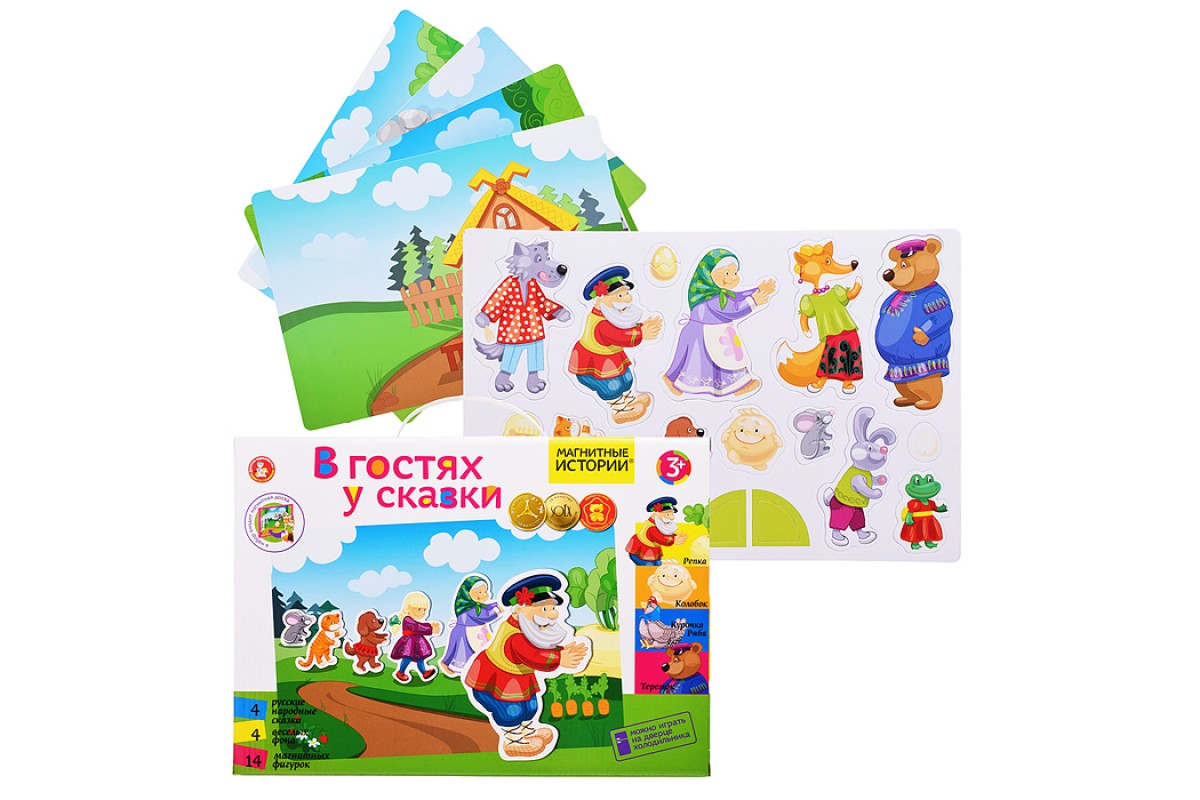 • В наборе 4 русские народные сказки, 4 веселых фона и 14 магнитных фигурок.