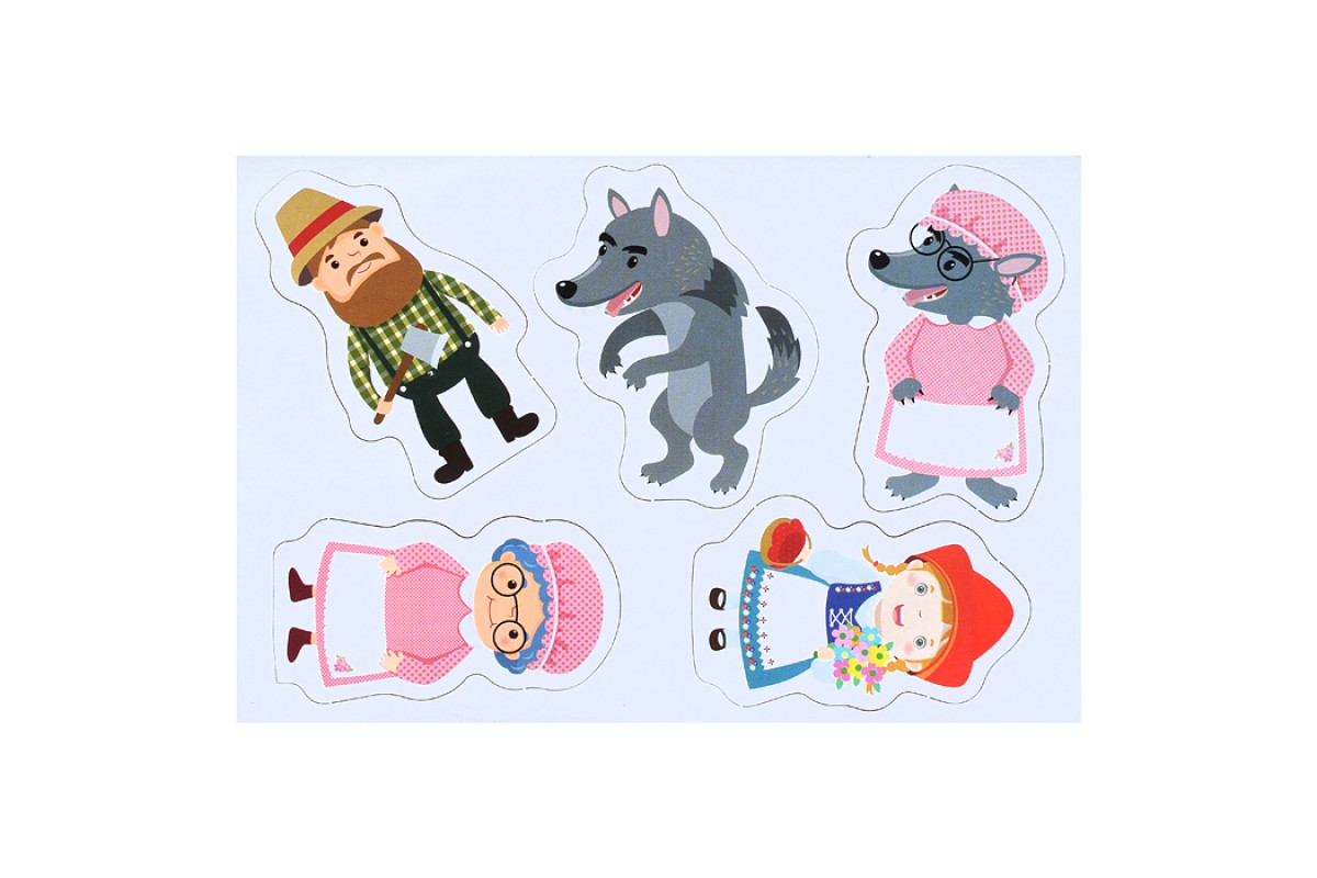 Состав набора: фигурные магниты - 5 шт. (высота - 9 см); сценарий сказки. В комплект входят 5 магнитов: Красная Шапочка, волк, бабушка, волк в одежде бабушки и дровосек.