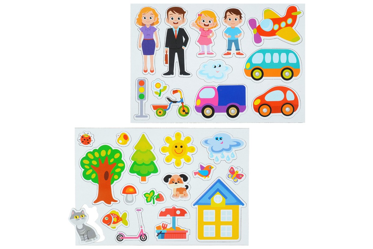 Состав набора: фигурные магниты - 28 шт. (от 3 до 5 см. в ширину, до 6 см. в высоту). Магниты размещены на листах-рамках размером 21,5х14,5 см, из которых легко вынимаются.