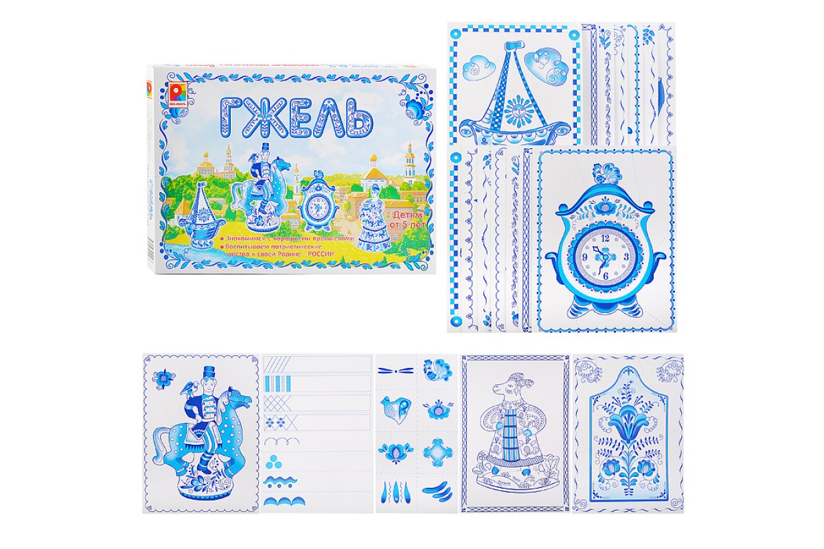 росписи, 48 карточек мозаики и 8 бумажных карт для рисования элементов росписи.