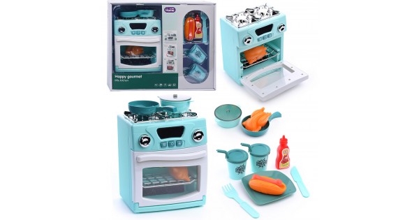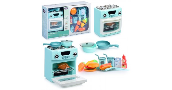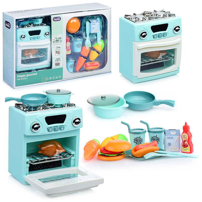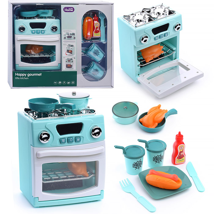 Бытовая техника "Кухонная плита" с набором посуды и продуктов, бирюзовый, (свет, звук) в коробке