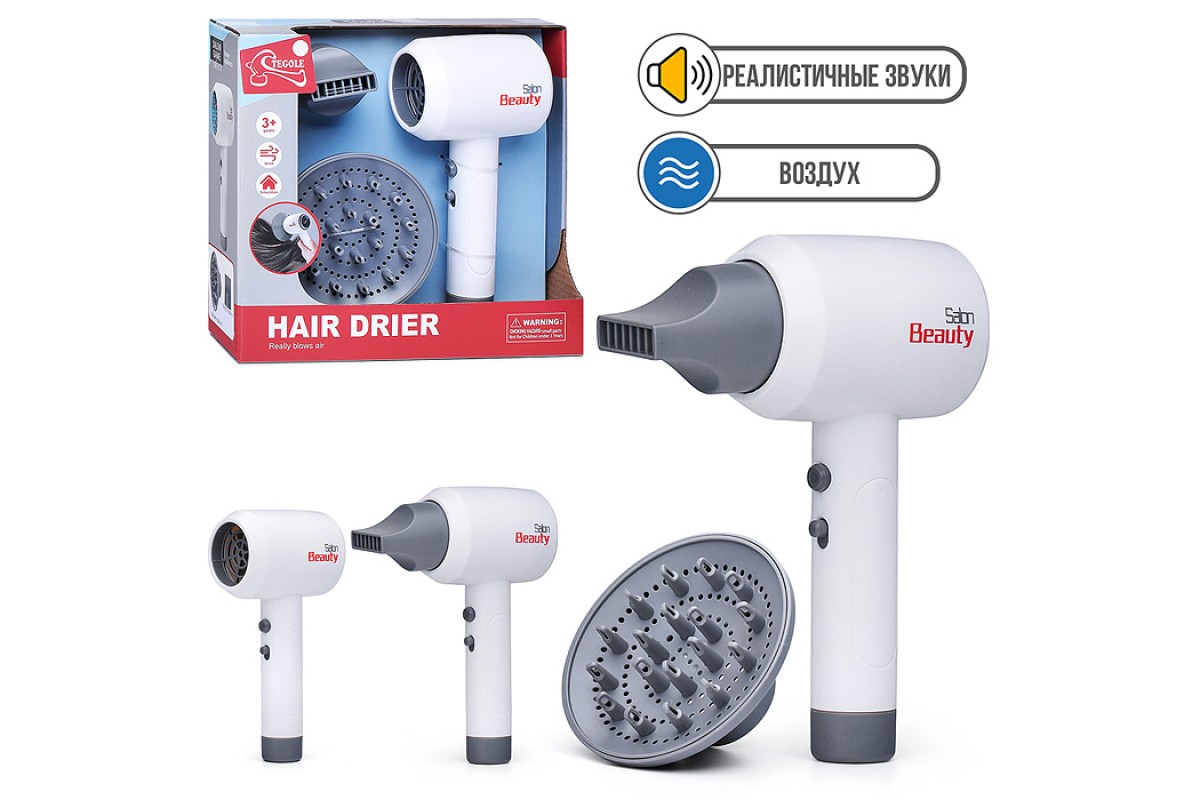 Игрушечный фен выдувает воздух, издает звук работающего прибора, насадки меняются.