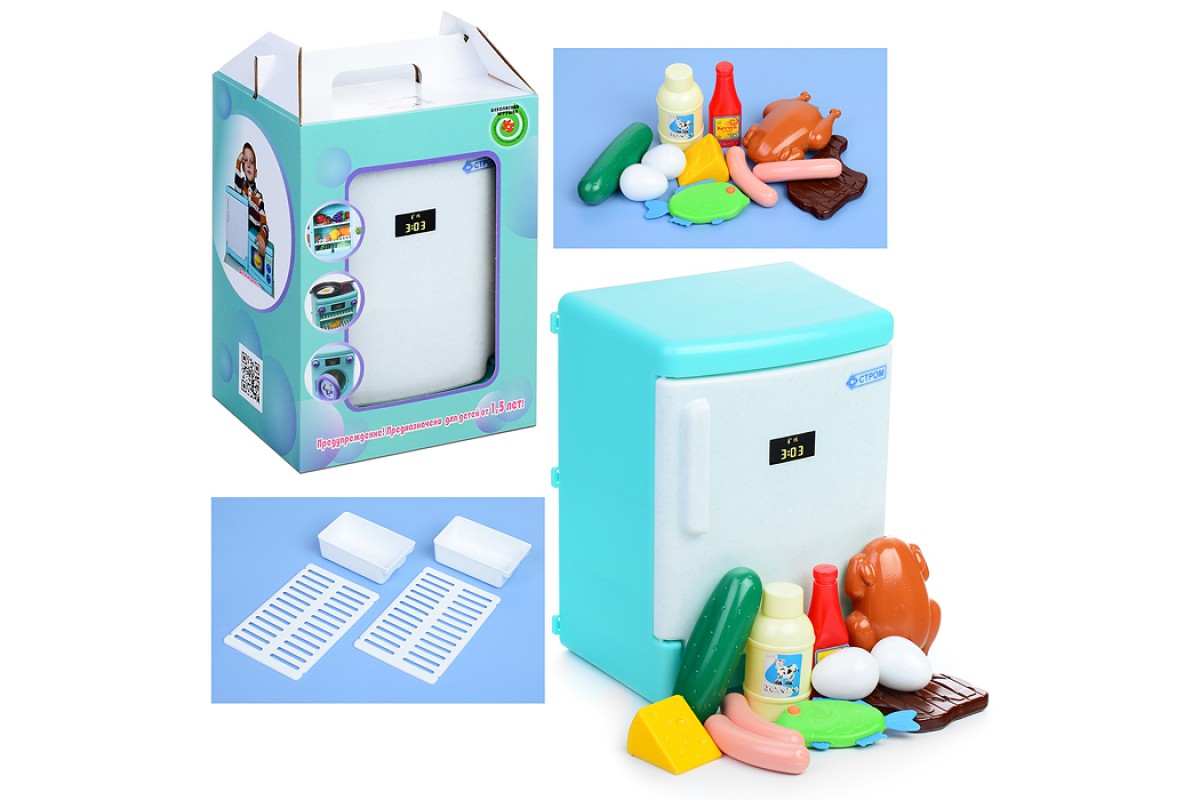 В набор входит: холодильник, яйцо 2 шт, рыба, курица, сосиски 2 шт., молоко, сыр, огурец, стейк, кетчуп.