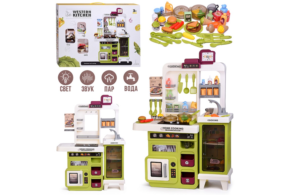 - Плита с парогенератором (холодный пар), с подсветкой конфорок и реалистичными звуками жарки и варки.