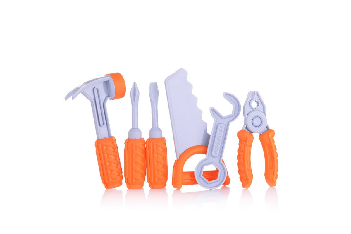 В наборе 6 предметов: плоскогубцы, отвертка крестовая, отвертка с плоским шлицем, молоток, гаечный ключ, пила