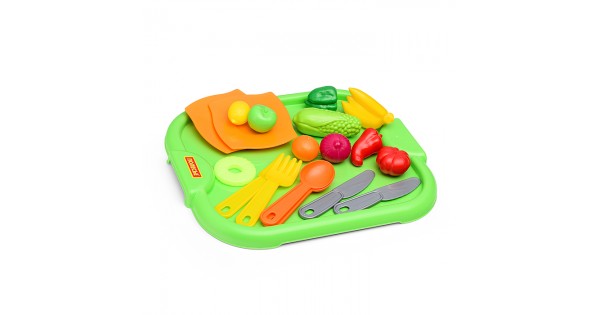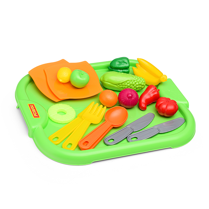 Набор детской посуды с зелёным подносом и набором продуктов (18 элементов) (в сеточке)