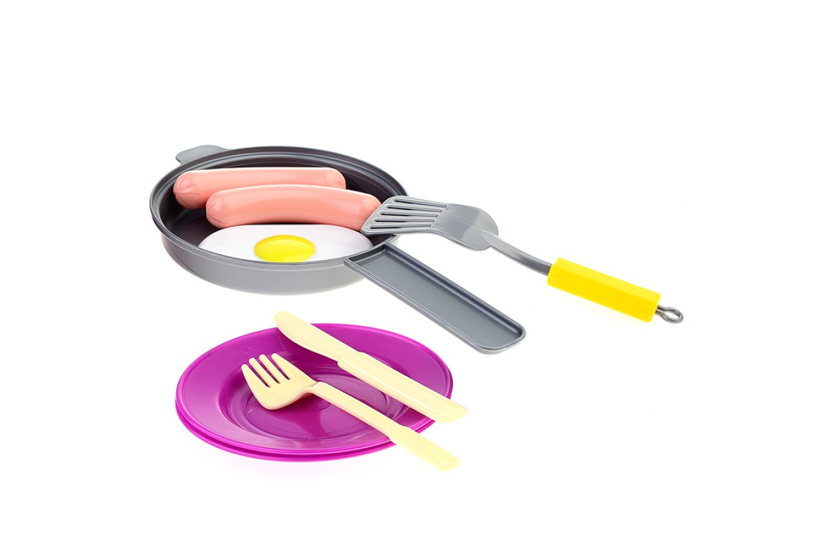 Комплектация: сковорода с крышкой 1 шт., тарелка десертная 2 шт., вилки 2 шт., нож 2 шт., лопатка 1 шт., сосиски 2 шт., яичница 1 шт.
