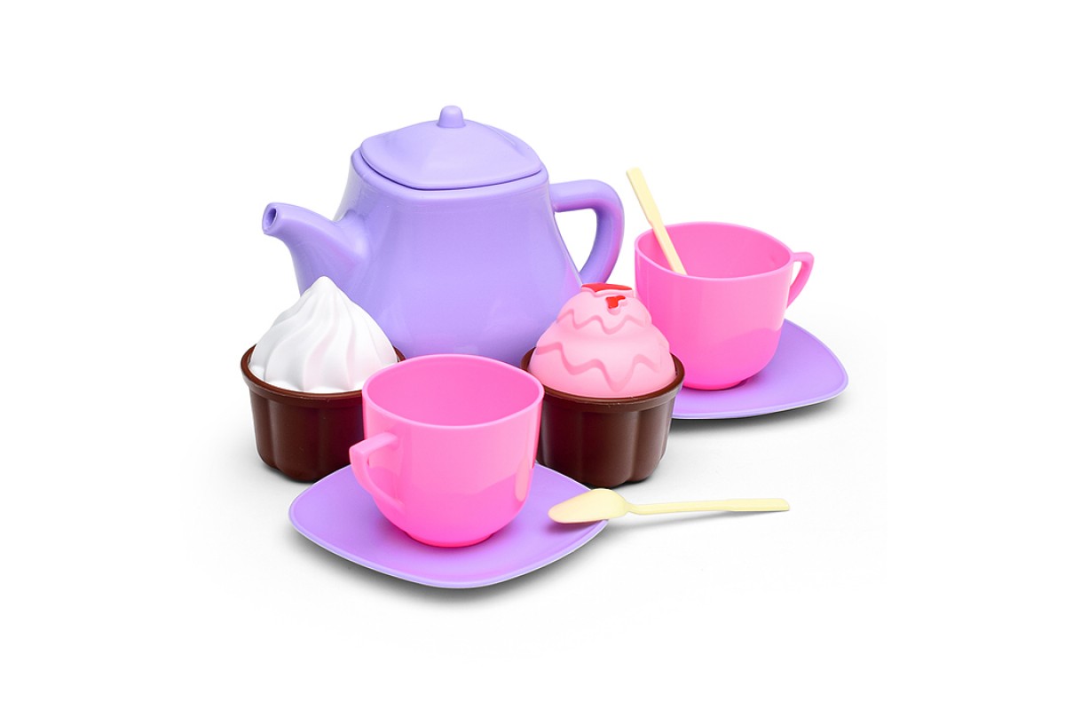 В комплекте: чайник с крышкой (15х10х11 см); 2 чашки чайные (d=5.8 см.; h=5 см); 2 блюдца (10х10х1 см.); 2 ложки чайные (9 см.); 1 кекс (5.8х5.8х7.5 см); 1 кекс (5.8х5.8х7 см).