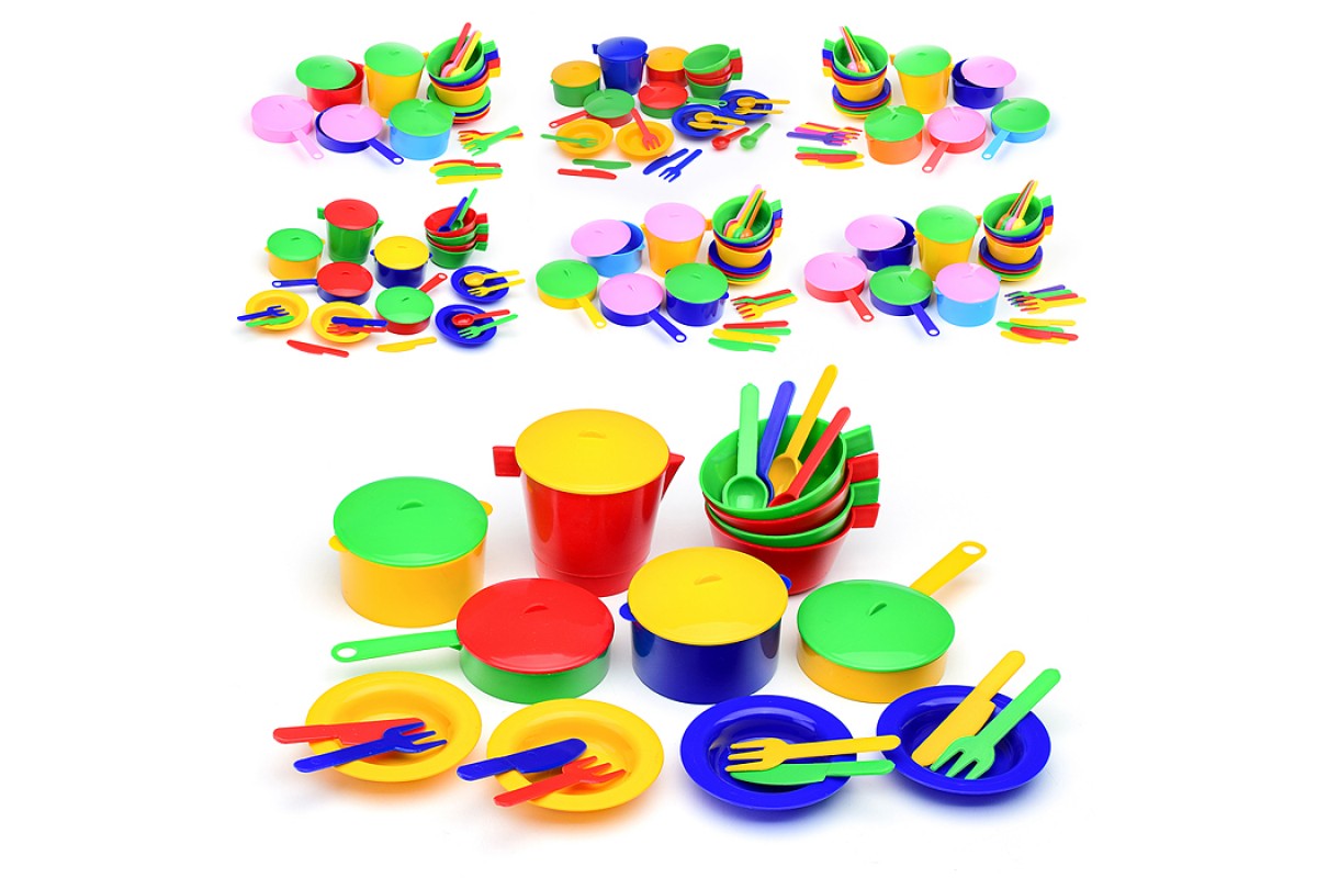 В состав набора входят: кастрюля с крышкой (диаметр 7,5 см.; высота 4 см.) - 2 шт., сковорода с крышкой (диаметр 7,5 см.; высота 2 см.) - 2 шт., чайник с крышкой (7,5х10х7,3 см.) - 1 шт., блюдце (диаметр 8 см.) - 4 шт., чашка (диаметр 7,5 см.; высота 4 см.) - 4 шт., вилка (длина 8 см.) - 4 шт., ложка (длина 8 см.) - 4 шт., ножик (длина 8 см.) - 4 шт.