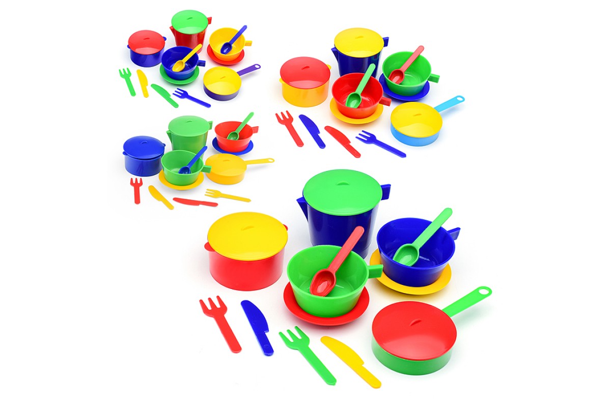 В состав набора входят: кастрюля с крышкой (диаметр 7,5 см.; высота 4 см.) - 1 шт., сковорода с крышкой (диаметр 7,5 см.; высота 2 см.) - 1 шт., чайник с крышкой (7,5х10х7,3 см.) - 1 шт., блюдце (диаметр 8 см.) - 2 шт., чашка (диаметр 7,5 см.; высота 4 см.) - 2 шт., вилка (длина 8 см.) - 2 шт., ложка (длина 8 см.) - 2 шт., ножик (длина 8 см.) - 2 шт.