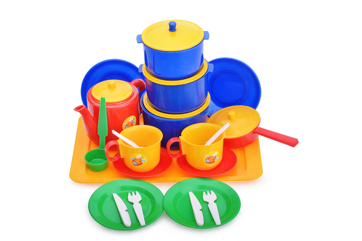 которые ей понадобятся во время приготовления еды для своих куколок. Здесь и кастрюльки разной величины, и сковороды, и тарелки.