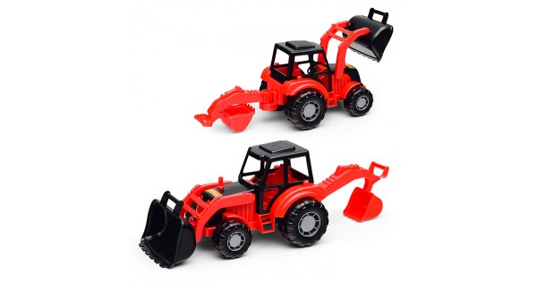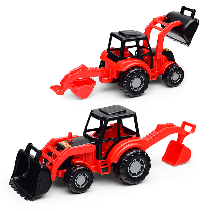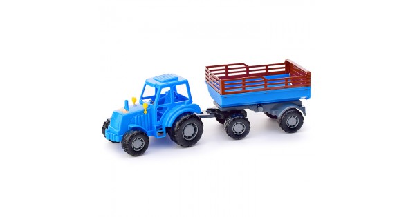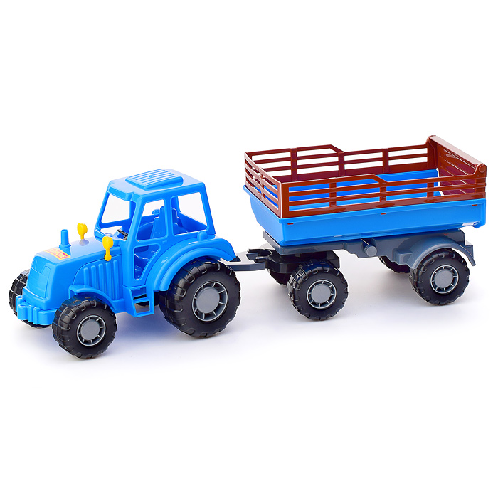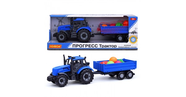 Трактор "Прогресс" с бортовым прицепом инерционный (синий) + набор продуктов (7 элементов) (в коробке)