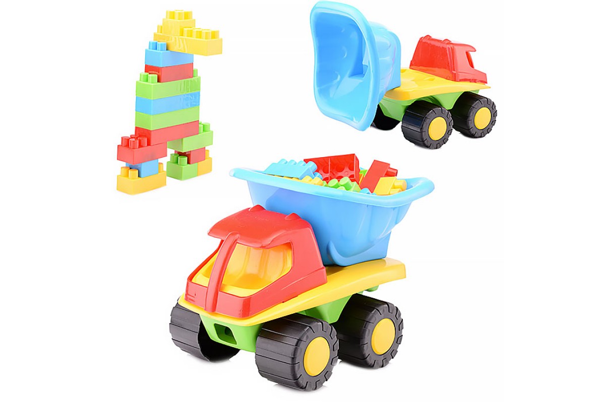 • Машинка не имеет острых углов, кузов самосвала поднимается и опускается.