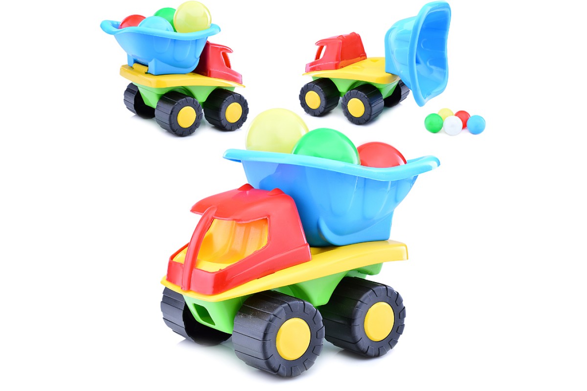 • Машинка не имеет острых углов, кузов самосвала поднимается и опускается.