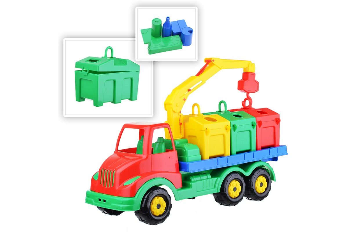 • На машине установлен поворотный манипулятор с крюком. При помощи этого манипулятора ребенок сможет загружать и снимать контейнеры с платформы автомобиля.