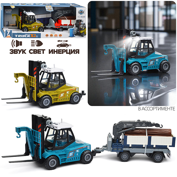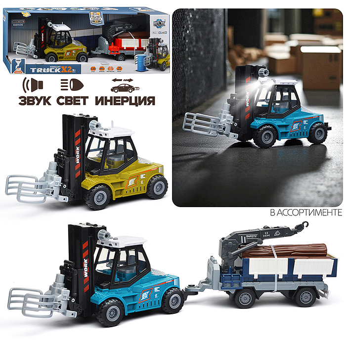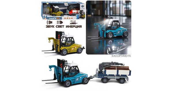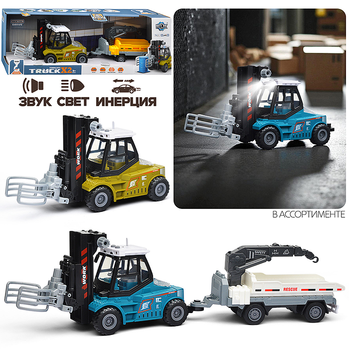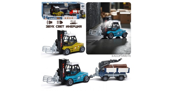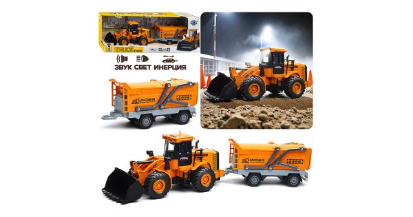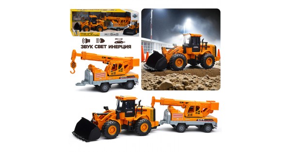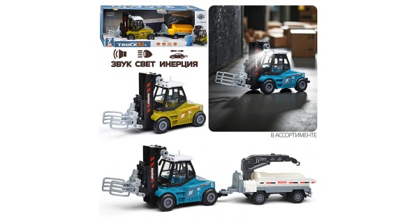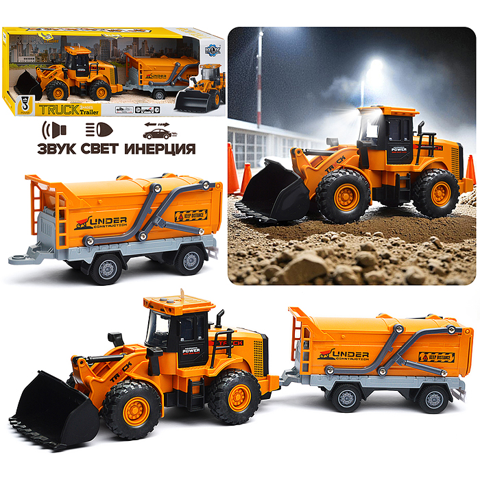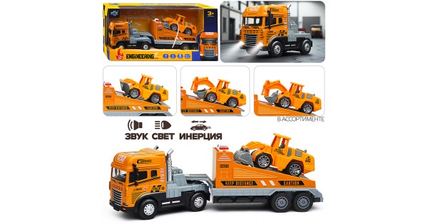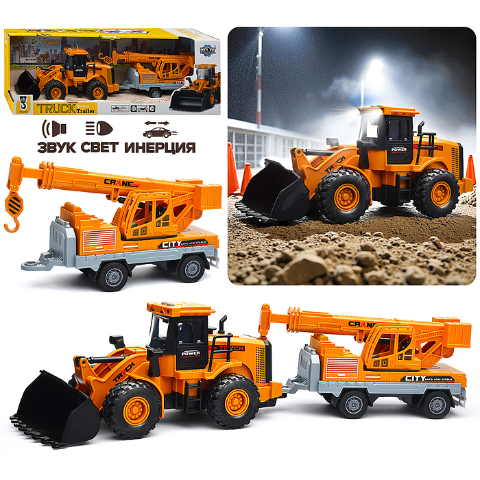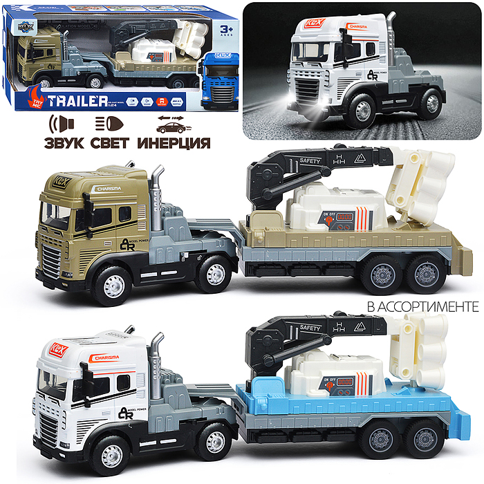Машина "Тягач с прицепом и прожекторами на манипуляторе" (свет, звук) в коробке
